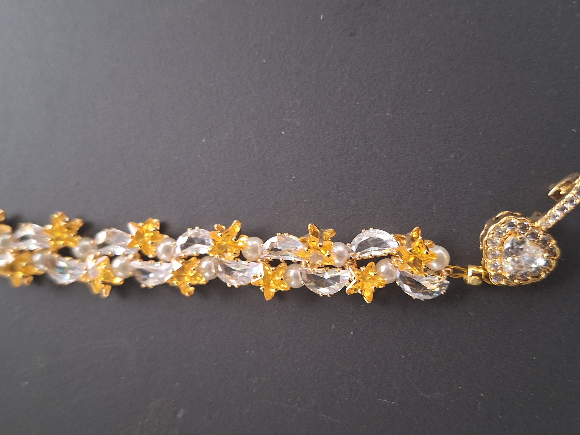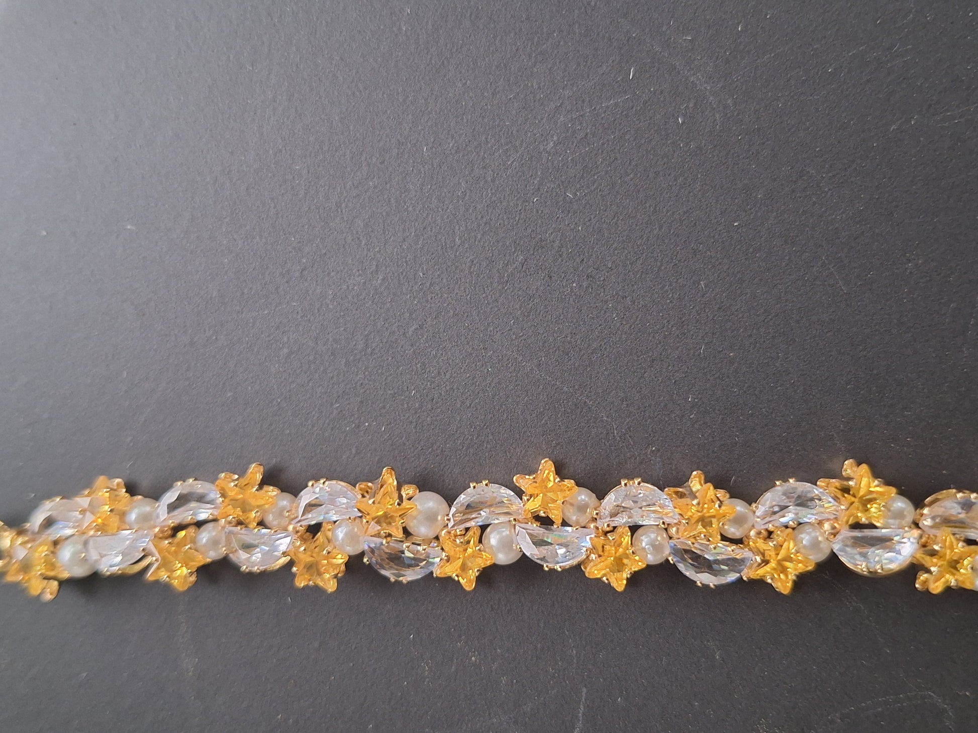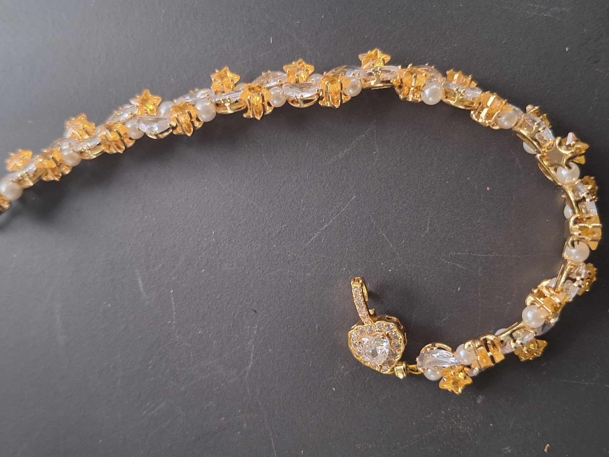 Zircon moon and star bracelet. Gazing at the stars pales to this beauty. Heart clasp with diamonds surrounding small heart. 3mm pearls accent this bracelet