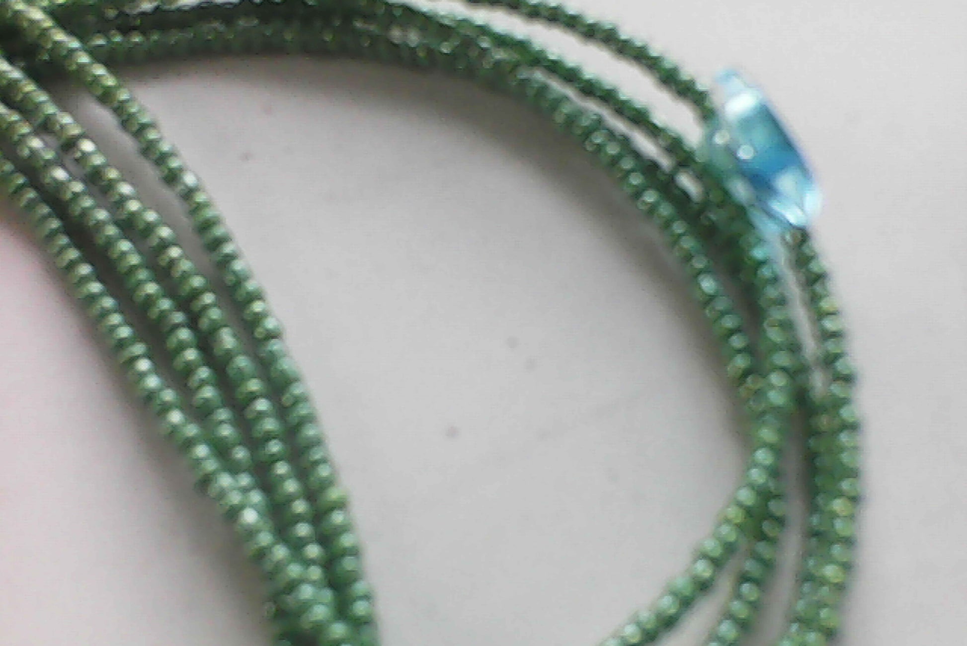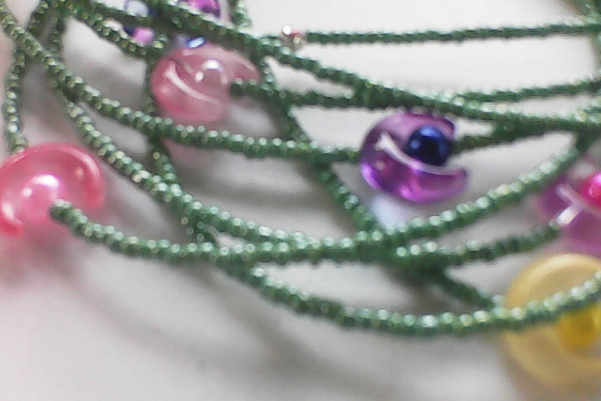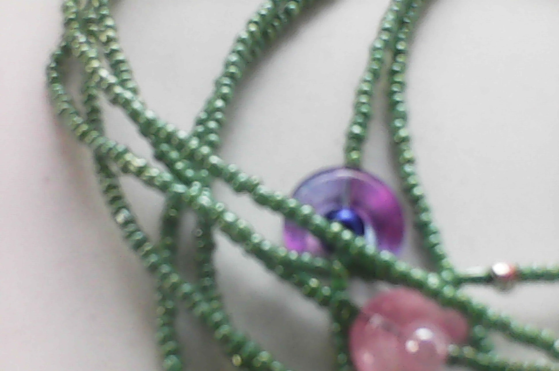 This versatile boho-style necklace features green seed beads paired with acrylic multi-colored moon charms and coordinating beads. Measuring approximately 86 inches in length, it can be worn doubled or tripled to suit your style. Its layered look adds a unique, artistic touch to any outfit, making it a standout accessory for those who appreciate handcrafted elegance.
